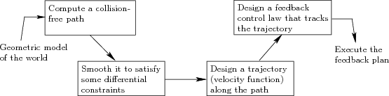If a plan is used for refinement, then a planner accepts it as input and determines a new plan that is hopefully an improvement. The new plan may take more problem aspects into account, or it may simply be more efficient. Refinement may be applied repeatedly, to produce a sequence of improved plans, until the final one is executed. Figure 1.19 shows a refinement approach used in robotics. Consider, for example, moving an indoor mobile robot. The first plan yields a collision-free path through the building. The second plan transforms the route into one that satisfies differential constraints based on wheel motions (recall Figure 1.11). The third plan considers how to move the robot along the path at various speeds while satisfying momentum considerations. The fourth plan incorporates feedback to ensure that the robot stays as close as possible to the planned path in spite of unpredictable behavior. Further elaboration on this approach and its trade-offs appears in Section 14.6.1.