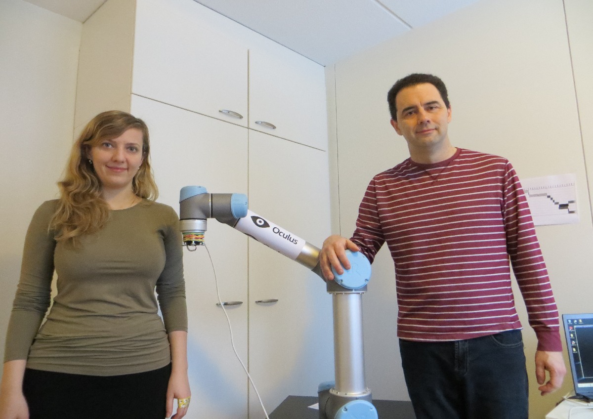 I was so hooked that I was debugging tracking software on the airplane ride back to Finland, while twisting a sensor around that was connected via USB to a laptop that we just bought from Best Buy. In the months that followed, my wife Anna Yershova and I were working for Oculus from our apartment in Finland (see picture). We did things like gyro integration, tilt correction, sensor performance characterization, magnetometer calibration, offset head model, predictive tracking (to overcome latency), and early positional tracking experiments. It was great that Oculus bought us a UR5 robot arm to perform systematic studies (I don't advise anyone to live in a small apartment with a live robot arm).